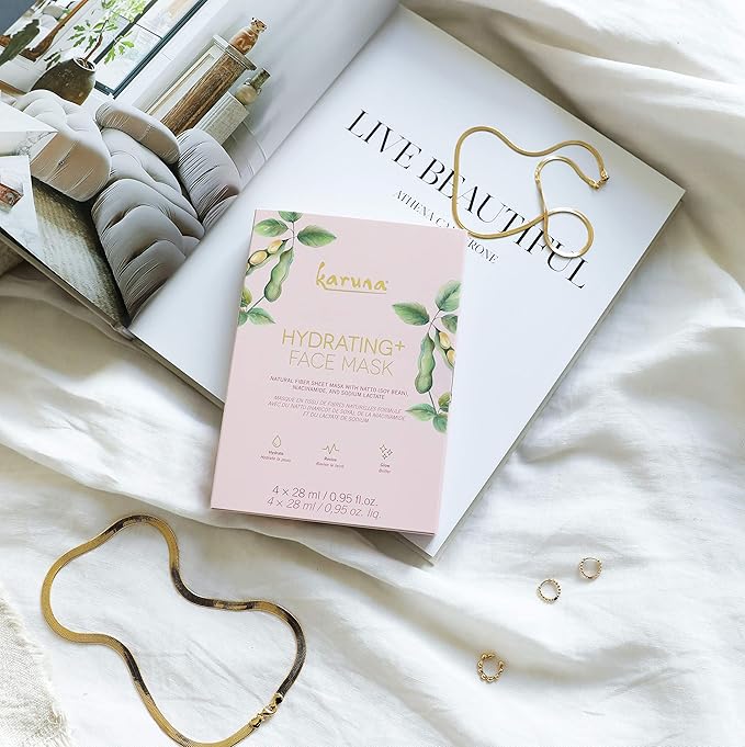Karuna Skin - Hydrating+ Sheet Masks for Well-Moisturized & Hydrated Skin, Glow-Enhancing Face Masks Skin Care Products, Hydrating Facial Masks with Natto, Niacinamide & Sodium Lactate, 4 Sheets