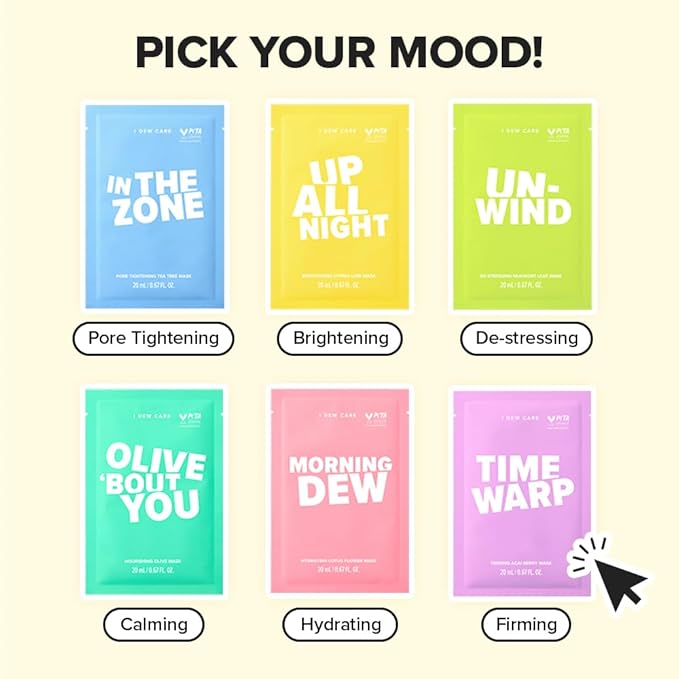 - MASKS FOR DIFFERENT SKIN CONCERNS: IN THE ZONE (3x): Calms skin and tightens the look of pores | MORNING DEW (2x): Helps skin look dewy & moisturized | OLIVE ‘BOUT YOU (2X): Nourishes and hydrates skin.