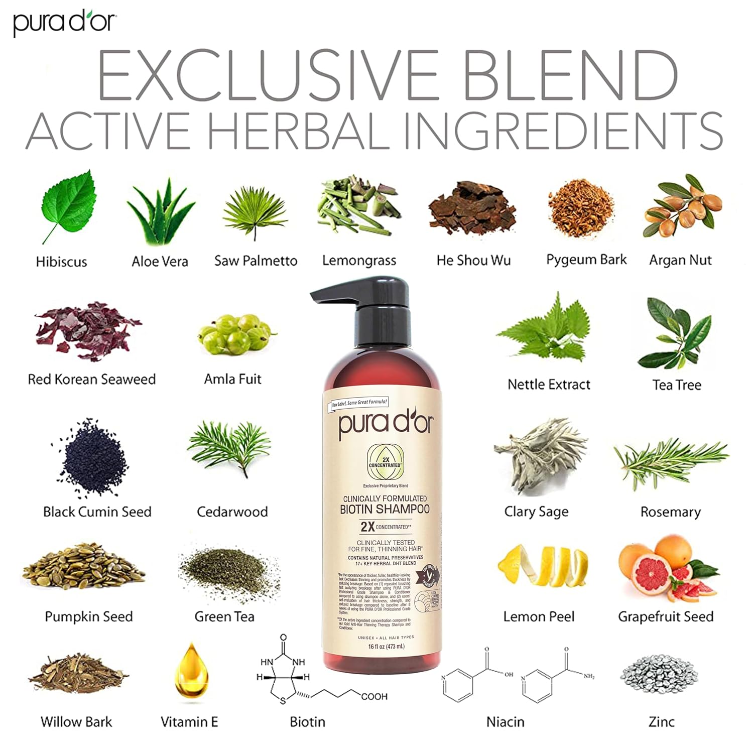 PURA D'OR Clinically Formulated Biotin Shampoo & Conditioner For Hair Thinning - 2X Concentrated Proprietary Herbal Blend Thickening Products For Women & Men, Sulfate Free, 16oz x2