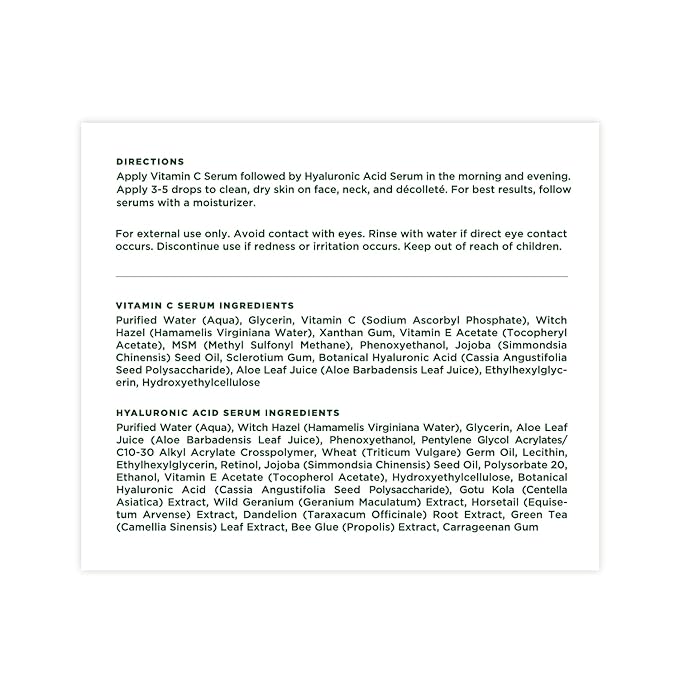 - INSTRUCTIONS: At Morning and night, cleanse your face thoroughly. Apply a few drops of Vitamin C serum gently onto the skin, focusing on areas with fine lines or uneven tone. Allow to absorb. Follow with Hyaluronic Acid serum, patting it onto the skin to boost hydration. Finish with your favorite moisturizer. For best results, use daily.