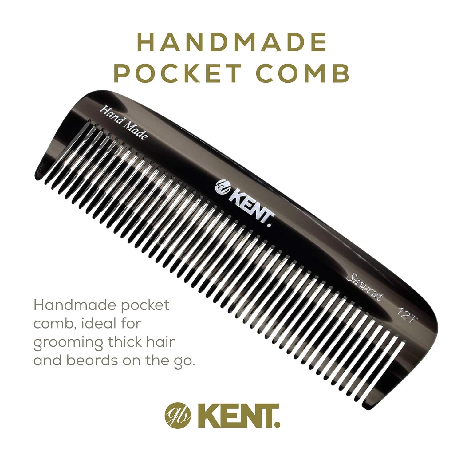 Kent 12T Black Graphite Pocket Comb - Handmade Wide Tooth Hair Comb for Men, Women, and Kids - Travel, Beard, and Mustache Comb - Saw Cut and Hand Polished Made in England