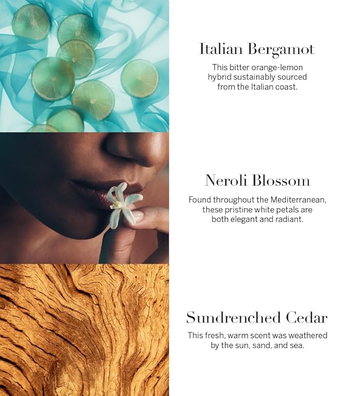 • Scent Notes: Italian bergamot, neroli blossom, and sundrenched cedar
