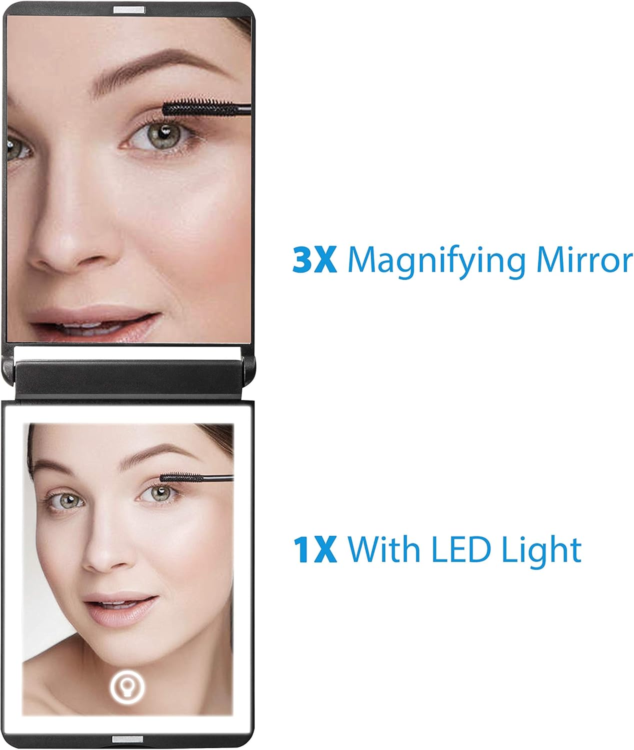 WOBSION Lighted Compact Mirror, Rechargeable Travel Makeup Mirror with Light,1x/3x Magnifying,Folding Portable Mirror,Dimmable,Gifts for Girls,Black