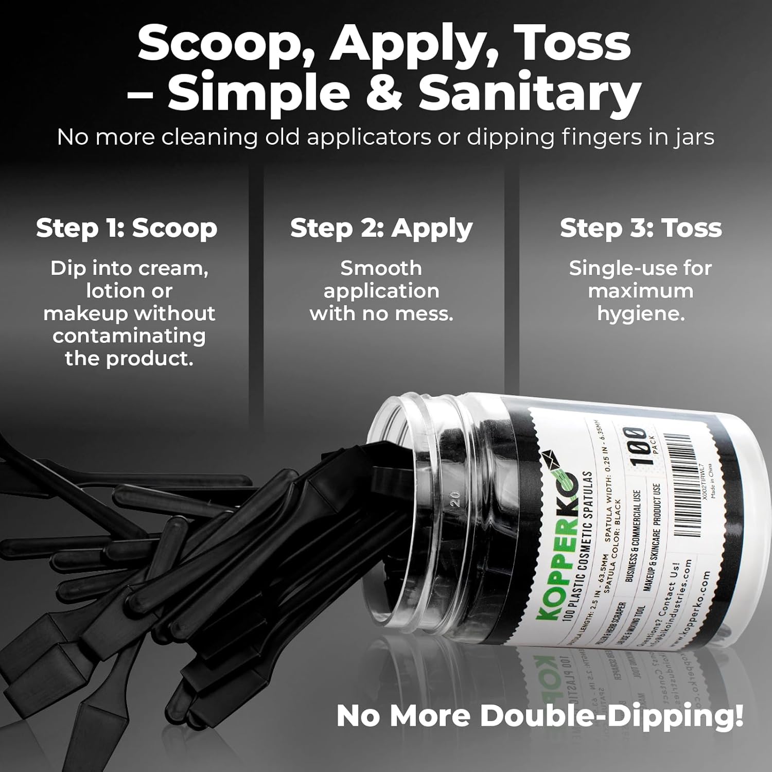 - Clean Out Your Containers: Maximize product use with our 100 pack of 0.25"x2.5" recyclable cosmetic spatulas. Easily extract creams, lotions, or makeup from containers, even in tight spaces, without getting product under your nails