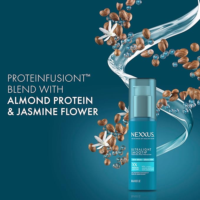 - HAIR TREATMENT WITH PROTEINFUSION: With Almond Protein and Jasmine Flower, this cream serum smooths frizz, tames flyaways, heat protects, and protects hair from humidity.