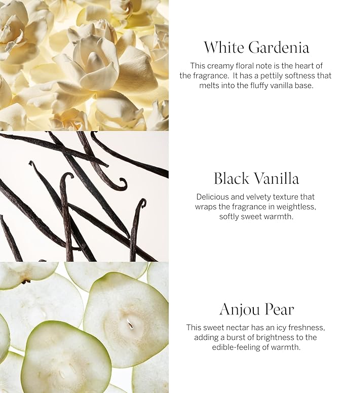 • Scent notes of white gardenia, anjou pear, and black vanilla.
