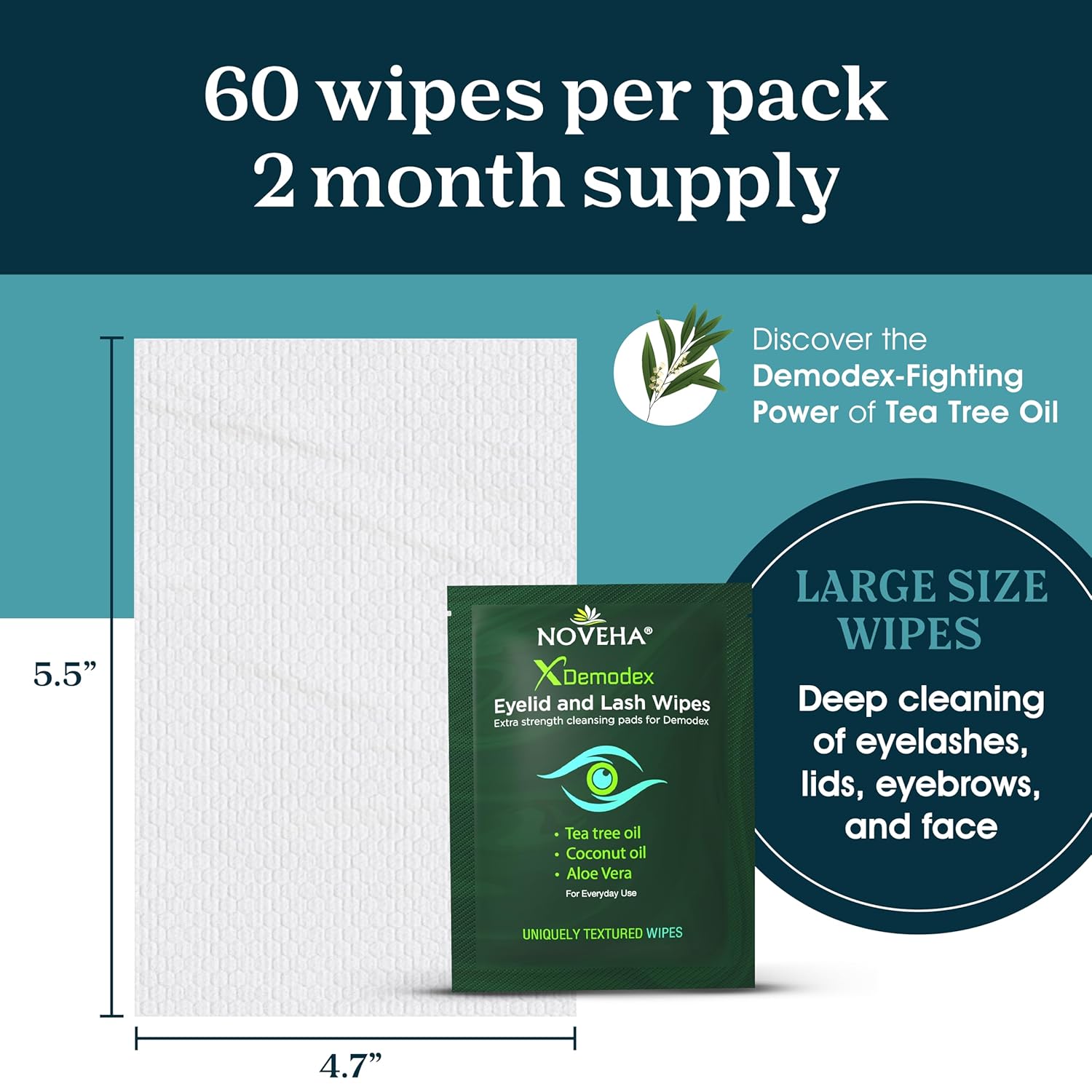 NOVEHA Demodex Eyelid & Lash Wipes | Box Of 60 Individually Wrapped Extra Strength Cleansing Eyelash Wipes - Battle Itchy & Irritated Eyes associated with Demodex Mites, Naturally Remove debris
