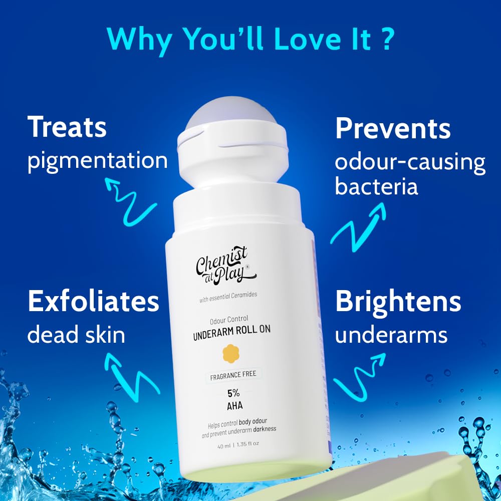 UnderArm Roll-On with 5% AHA| Lactic & Mandelic Acid|Prevents Odour, Brightens Skin & Exfoliates Underarm | For Sensitive Skin | Fragrance-Free | Alcohol & Aluminium Free | 1.35 fl oz
