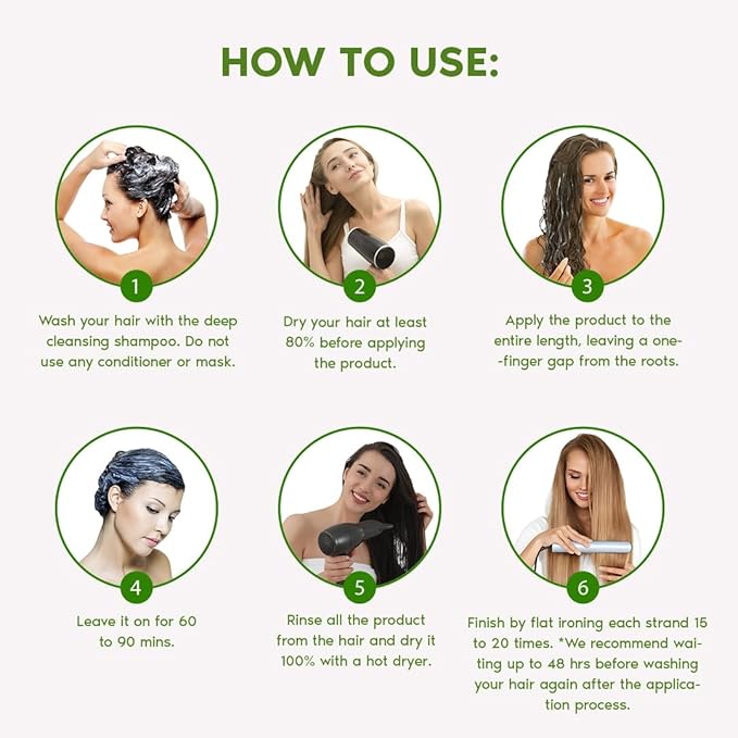 - 𝗘𝗔𝗦𝗬 𝗔𝗣𝗣𝗟𝗜𝗖𝗔𝗧𝗜𝗢𝗡/𝗙Á𝗖𝗜𝗟 𝗗𝗘 𝗔𝗣𝗟𝗜𝗖𝗔𝗥: After using anti-residue shampoo, dry 80% of your hair. Apply B-tox Treatment, leave for 40-60 mins. Dry with hot air, then flat iron each section 15-20 times and you're done! We recommend doing a strand test before applying the treatment. / Después de usar champú antirresiduos, seca el 80% de tu cabello. Aplica el Tratamiento de Botox, deja actuar de 40 a 60 minutos. Sécalo con aire caliente, luego pasa la plancha en cada sección de 15 a 20 veces ¡y listo! Recomendamos hacer una prueba de mechón antes de aplicar el tratamiento.