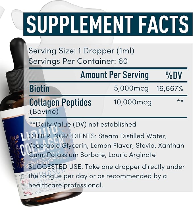 - Concentrated Liquid Collagen Peptides Supplement - Hair, Skin, Nail, Joints Support - Sublingual Drops by WINDSOR BOTANICALS - 10,000mcg Collagen, 5,000mcg Biotin - Lemon Flavor - 2-Month - 2 oz