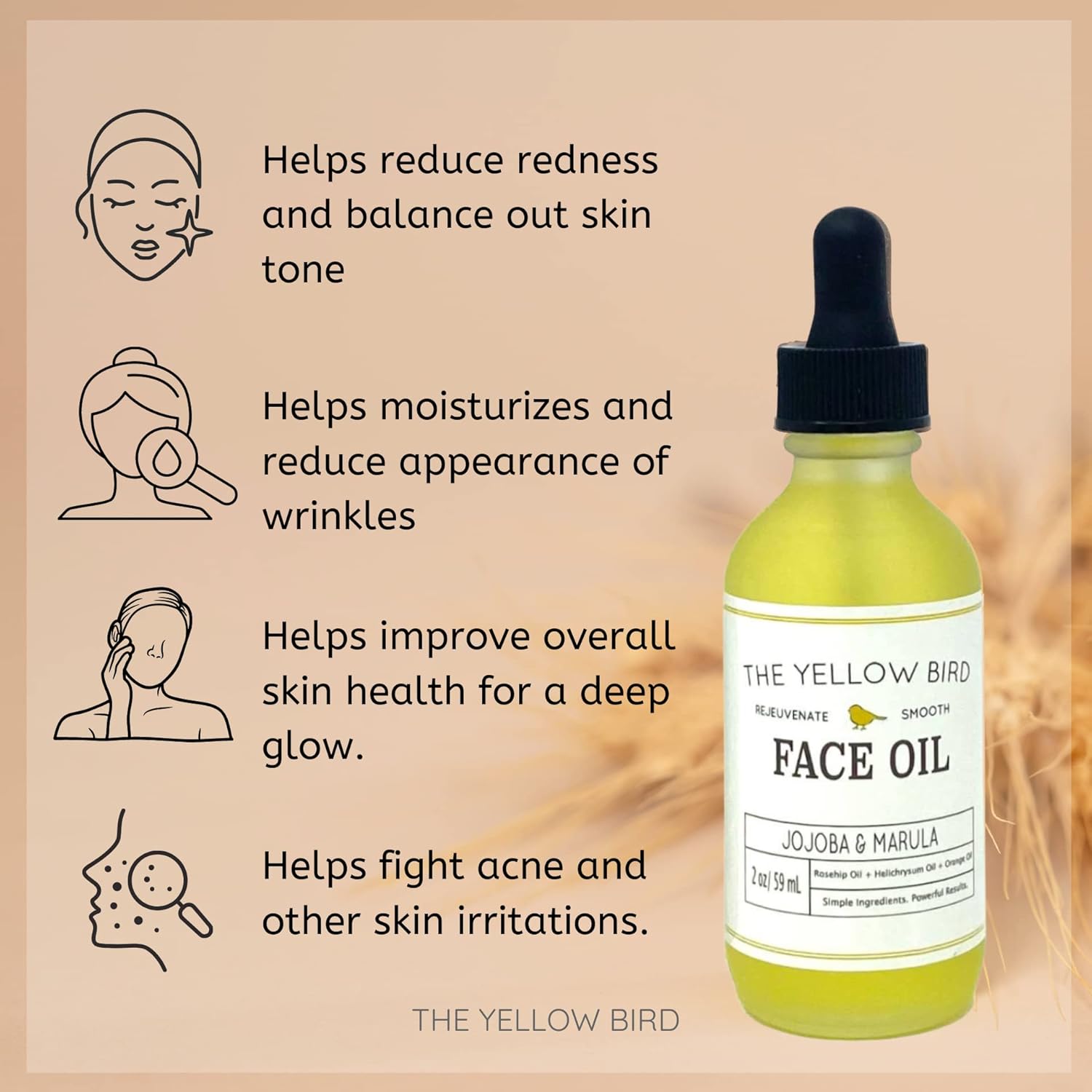 - Rejuvenating Face Oil - Enhance your skin’s radiance, avoid acne breakouts, and minimize the appearance of dull skin. This nutrient rich facial oil will keep your skin glowing.