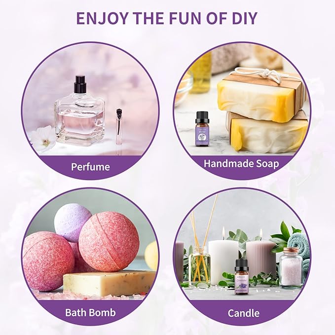 - Multiple Uses: Our Essential oil can be used a diffuser, also to make perfume, scented candles, cleaning products, hair care, slime making, bath bombs, soaps or for bath, massage and home care.