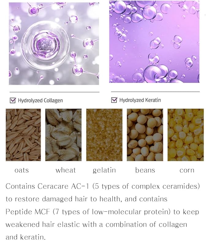 - Contains Ceracare AC-1 (5 types of complex ceramides) to restore damaged hair to health, and contains Peptide MCF (7 types of low-molecular protein) to keep weakened hair elastic with a combination of collagen and keratin.