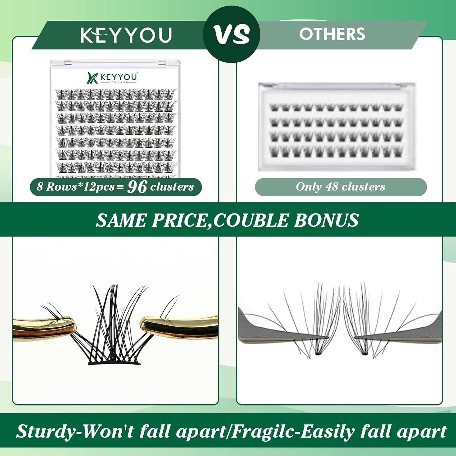 - 【Soft&Comfortable】KEYYOU lash cluster are made of imported materials,the stem line is thinner and softer, the eyelash cluster are lighter and more comfortable to wear.96 clusters in one tray ,more cost-effective.