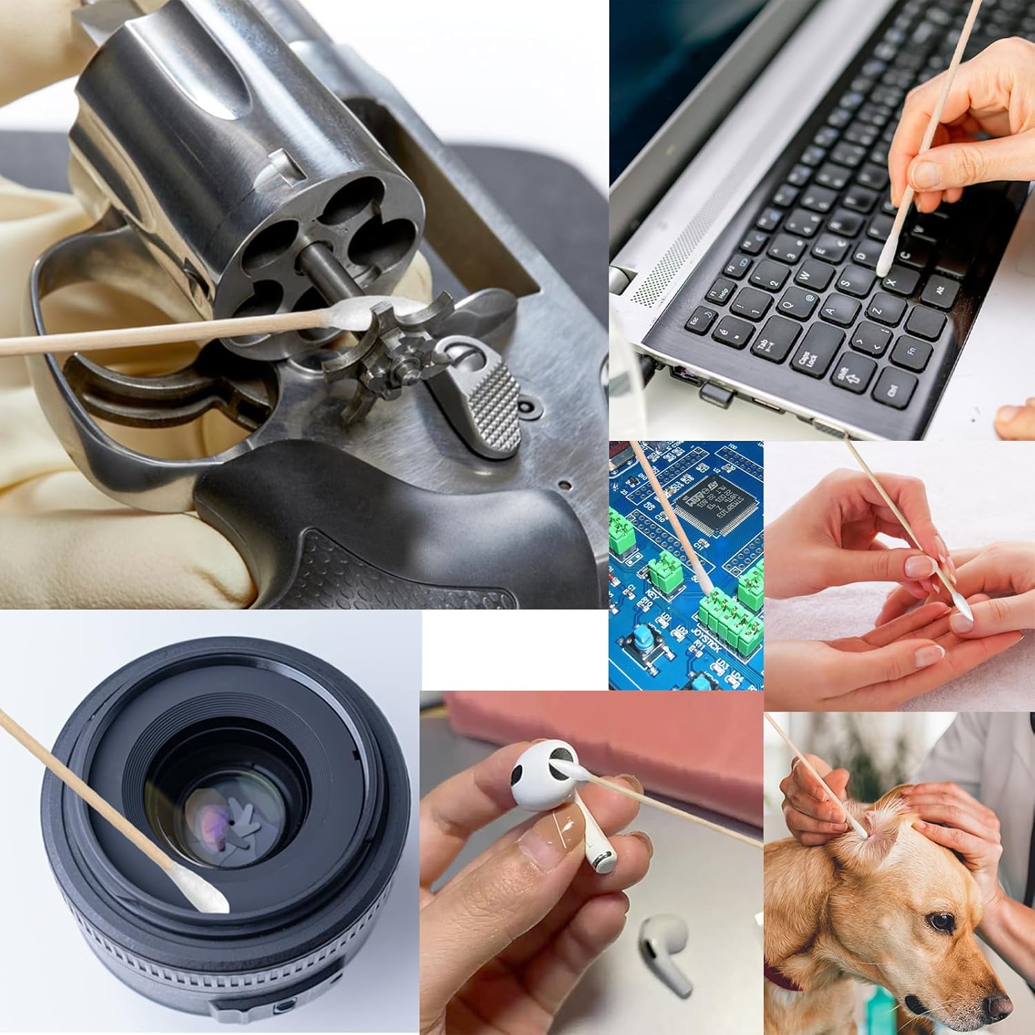 - Versatile Long Swabs: The long cotton swab is perfect for precise cleaning tasks. With 100 round and 100 pointed tips, they offer flexibility for detailed work. Ideal for electronics, guns, pet care, makeup, and crafts applications.