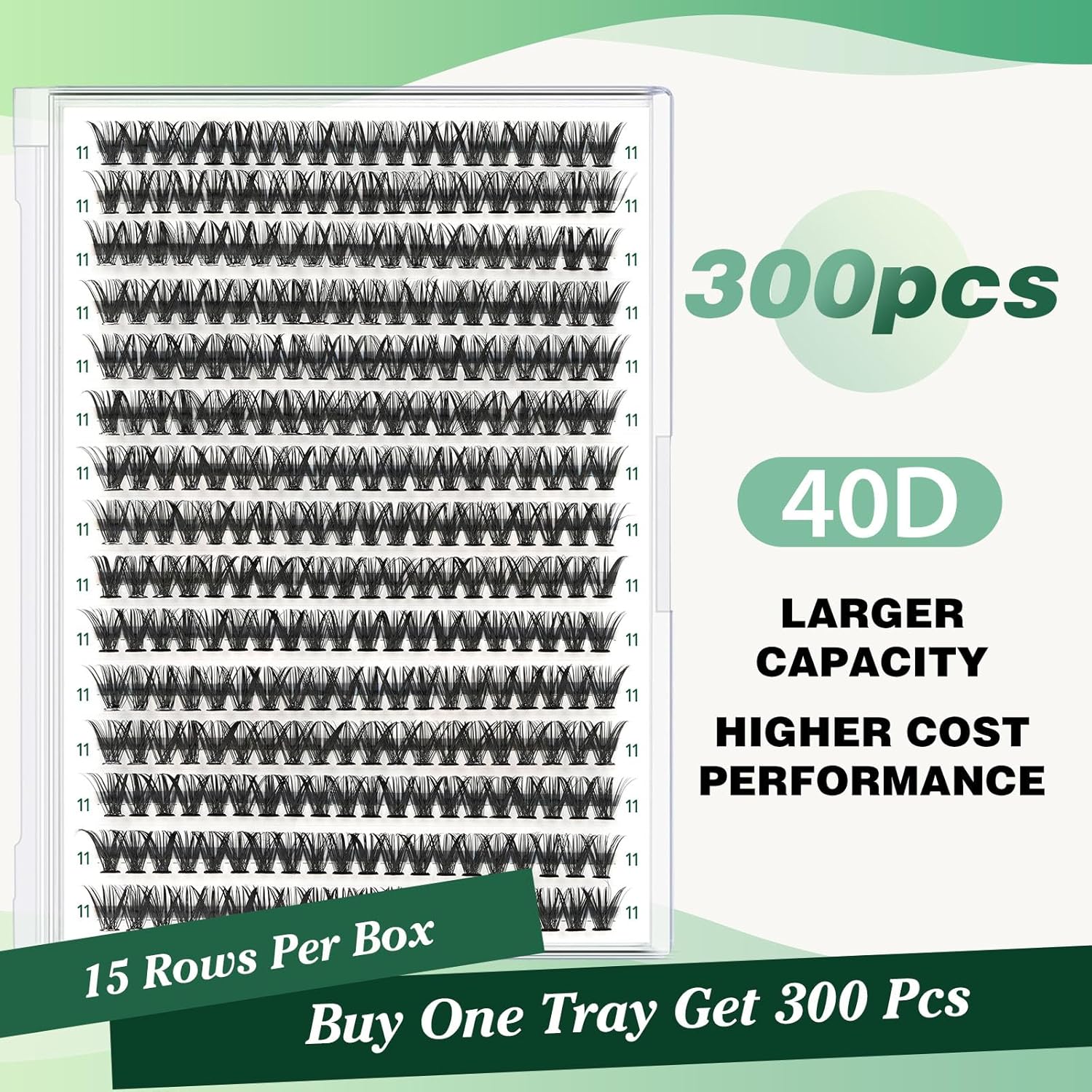 Lash Clusters 300pcs Individual Lashes 40D 0.07C Curl 11mm DIY Eyelash Extension KEYYOU Large Tray Volume Soft&Natural Cluster Lashes(40D-0.07C,11)