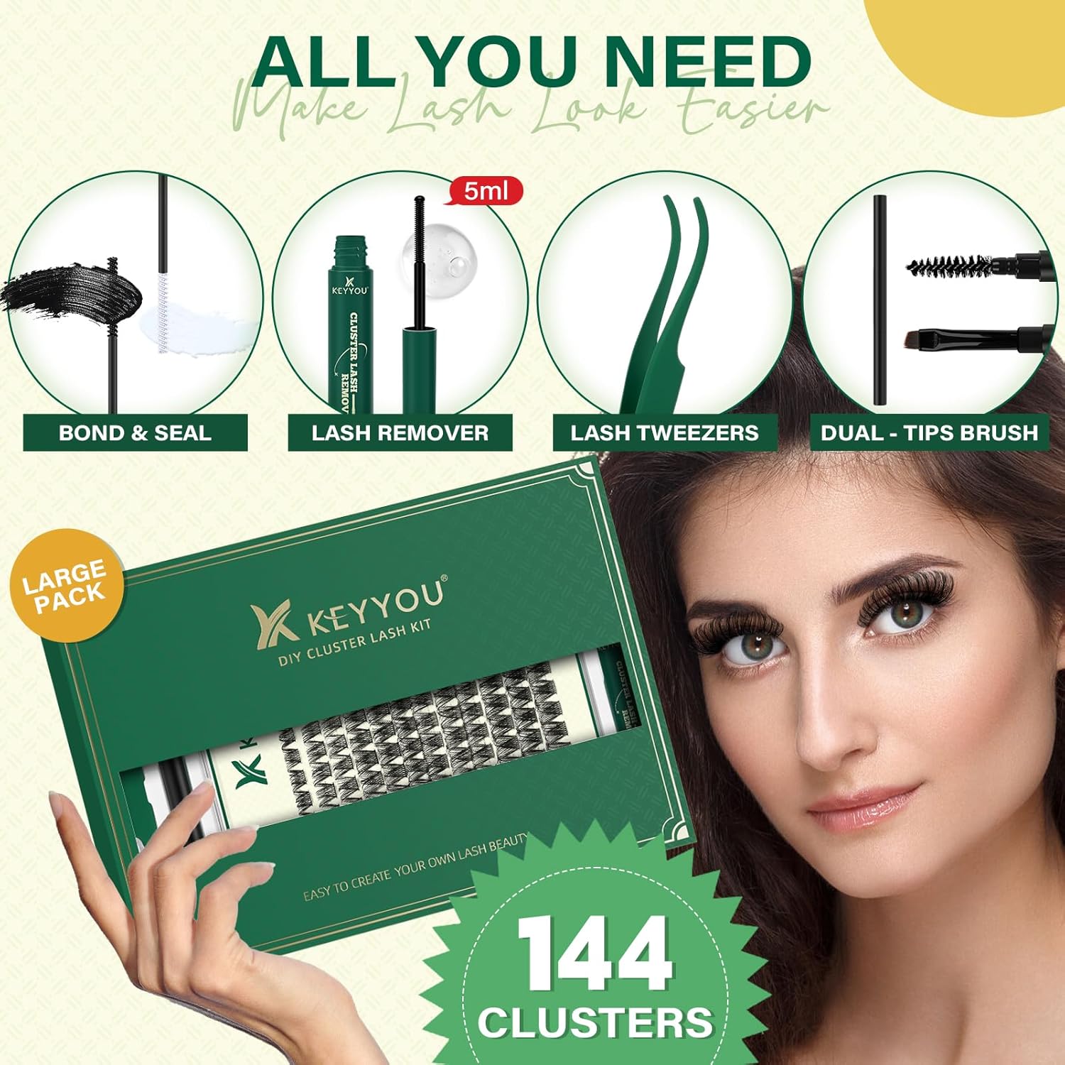 - 【Beginner-friendly Cluster Lash Kit 】The KEYYOU all-inclusive kit provides everything you need for effortlessly stunning lashes. From 144 thin band Cluster Lashes(8*1,10*2,12*3,14*3,16*2,18*1) to the Lash Bond and Lock, Cluster Lash Remover, Applicators, lash brush, we've got you covered from start to finish.