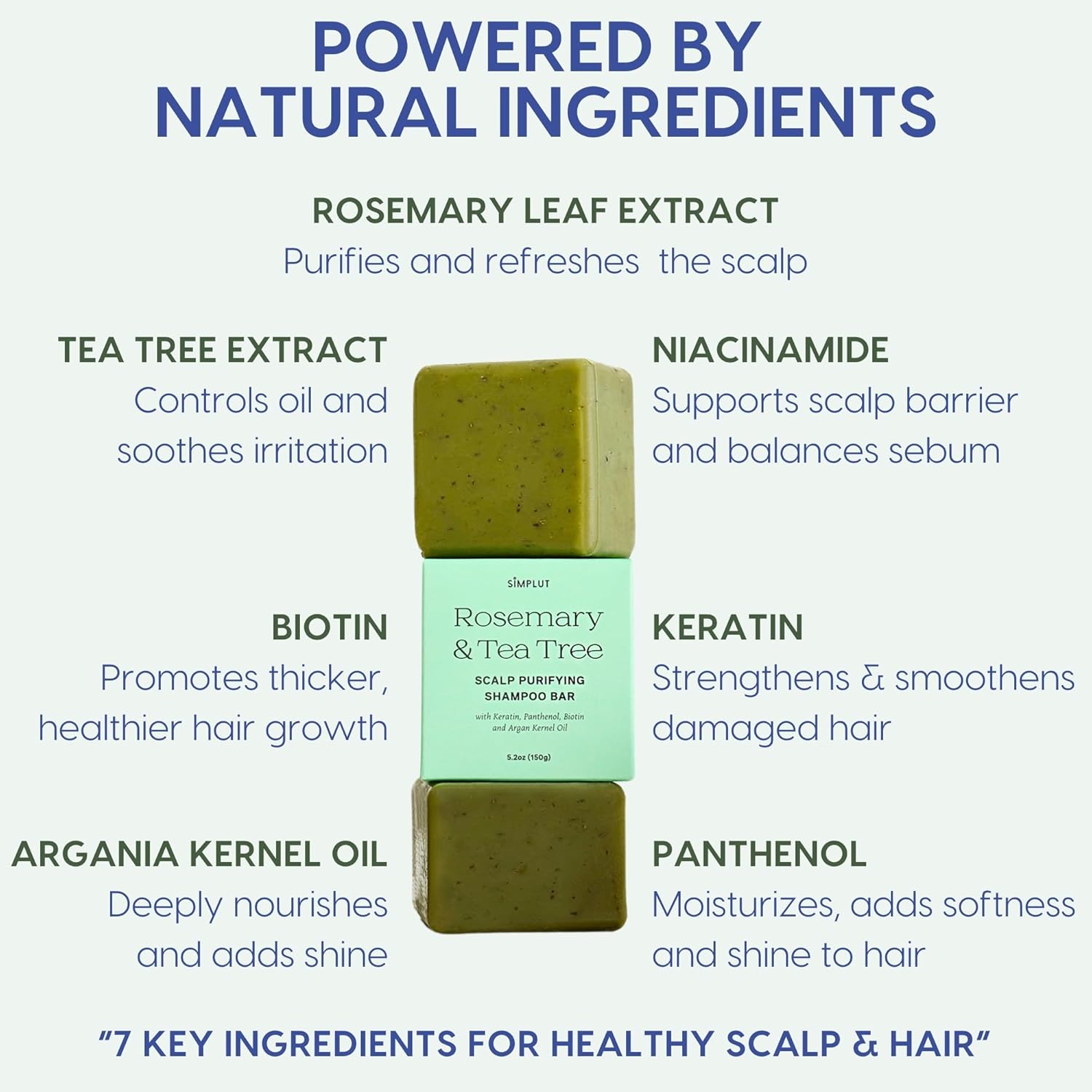 - REFRESHING SCALP CARE – ROSEMARY & TEA TREE SHAMPOO BAR Cleanse and clarify your scalp naturally with our tea tree & rosemary shampoo bar, specifically formulated to soothe itchy, oily scalps—a key benefit customers repeatedly praise. Enjoy a refreshing herbal fragrance and deep clean sensation that bottled shampoos can't deliver.