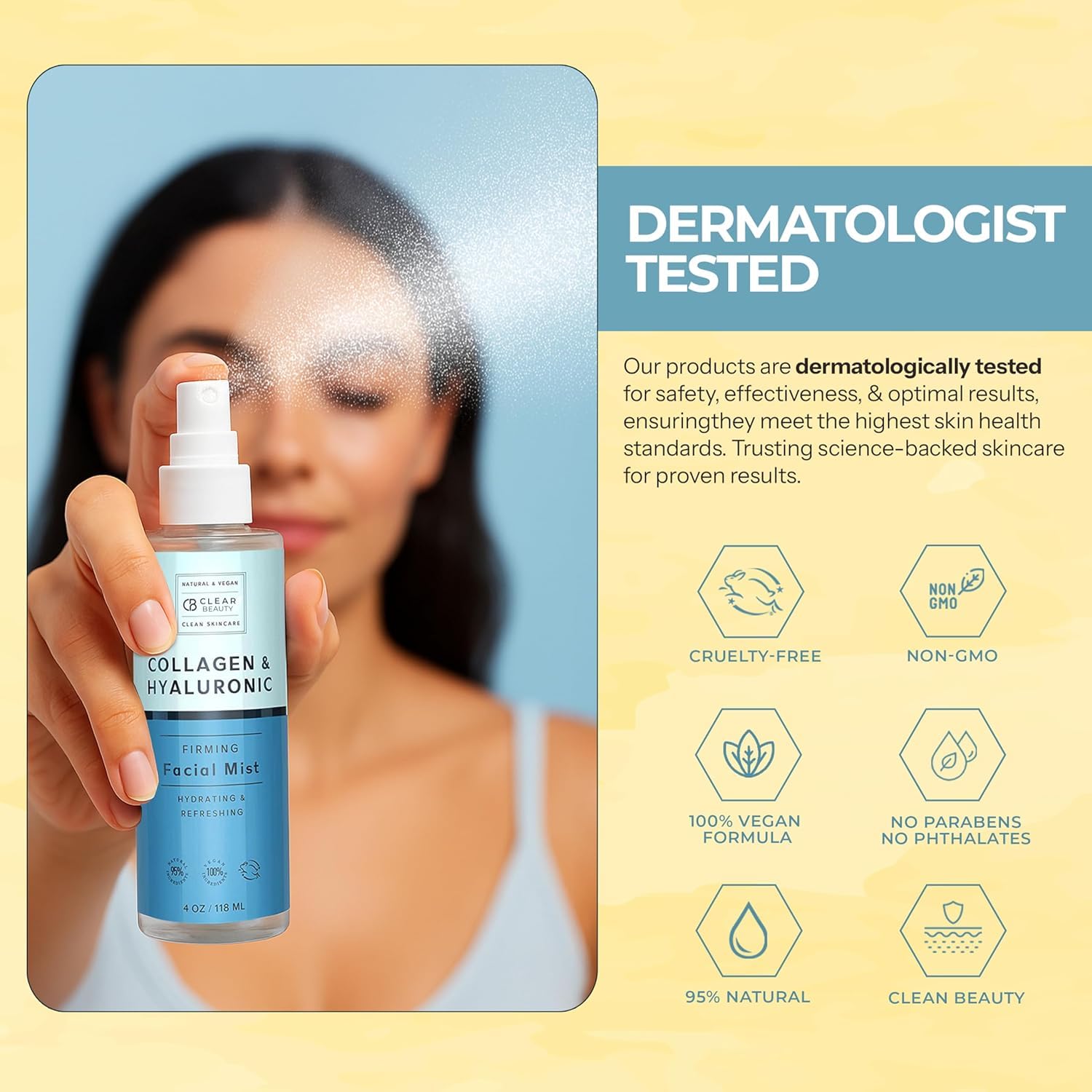 - MULTIPLE BENEFITS: Our Facial Mist Spray does more than just hydrate. It helps to improve the overall health and appearance of your skin. Hyaluronic acid and collagen work together to boost moisture retention, enhance skin elasticity, and promote a smooth and glowing complexion.