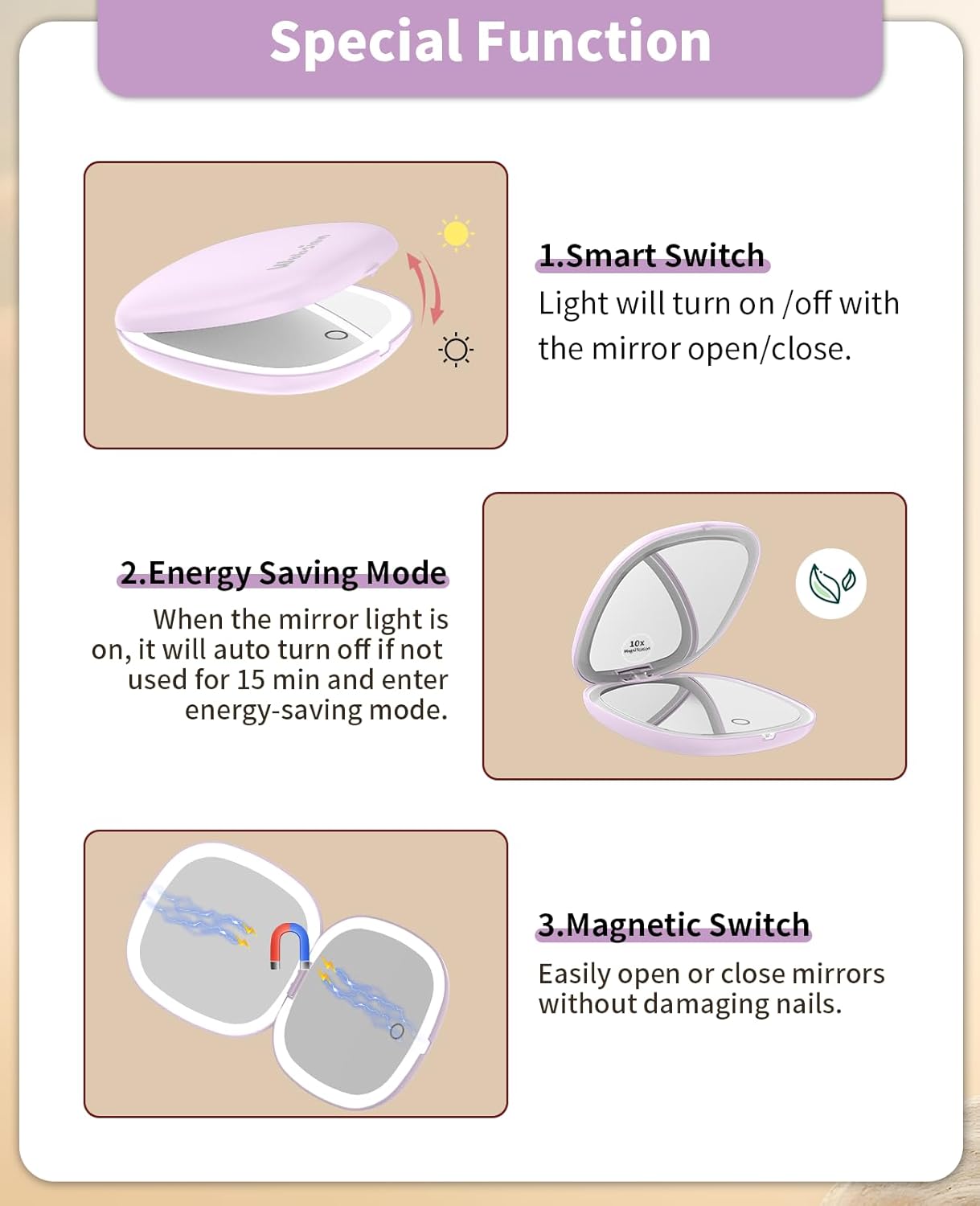 WOBSION Rechargeable Lighted Travel Makeup Mirror,1x/10x Compact Magnifying Mirror with Lights,Portable for Bag,4inch,Gift,Purple