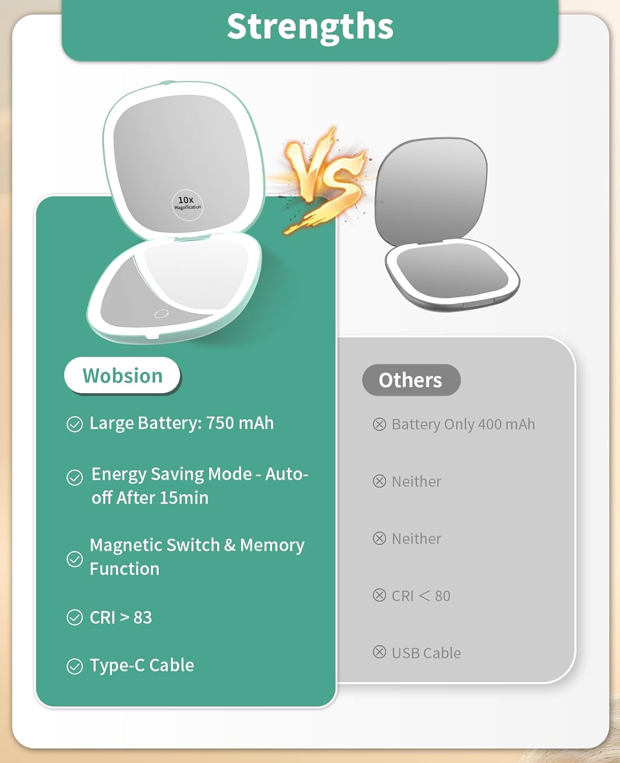 - 10x Magnifying:One side is a 1x HD mirror, equipped with white light to better restore your beauty, and the other side is a 10x magnifying mirror, which can help you magnify facial details. Tip: When using the 10x magnifying mirror, please keep a distance of less than 10 cm, otherwise it may cause normal dizziness and affect imaging