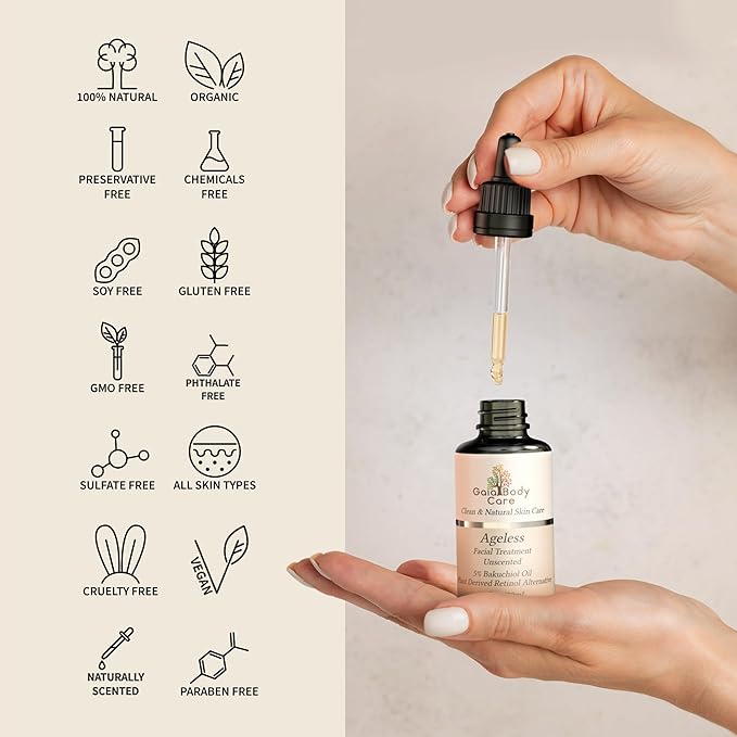 - Hydrating - This Gaia Body Care bakuchiol treatment is a uniquely formulated facial oil that hydrates and plumps the skin instantly, repairing dry skin, removing fine lines, and replenishing and boosting the skin's ability to retain moisture, revealing a smoother youthful complexion.