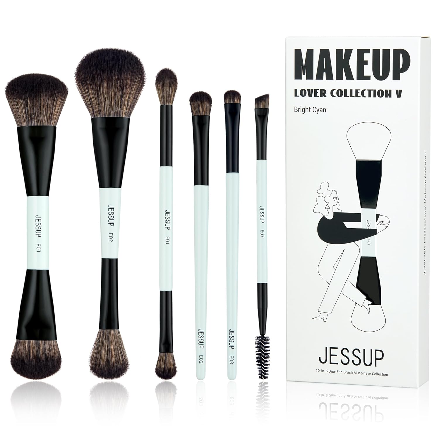 Jessup Makeup Brush Set 6pcs Double Sided Makeup Brushes Foundation Contour Blush Highlight Blending Eyebrow Brush Eyeshadow Brush, Vegan Fiber Make up Brush Bright Cyan T501