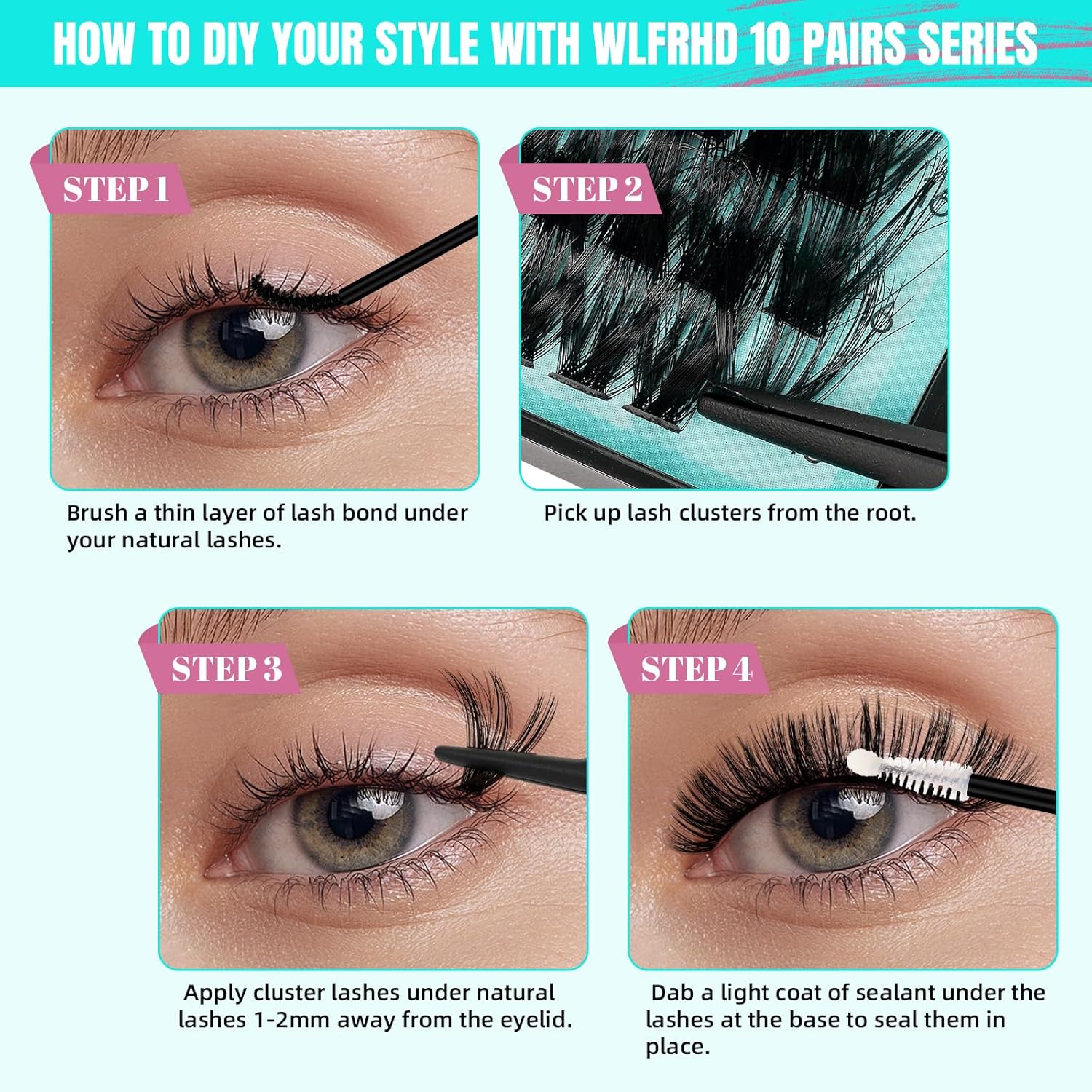 - 【Easy to Apply】:Firstly,curl your natural eyelash,gently brush your own eyelash with lash glue,then use the tweezers to pick up eyelash extension from the bottom of the false eyelashes,and apply the lash clusters under your natural lashes,finally brush the cluster eyelashes with the lash sealant.