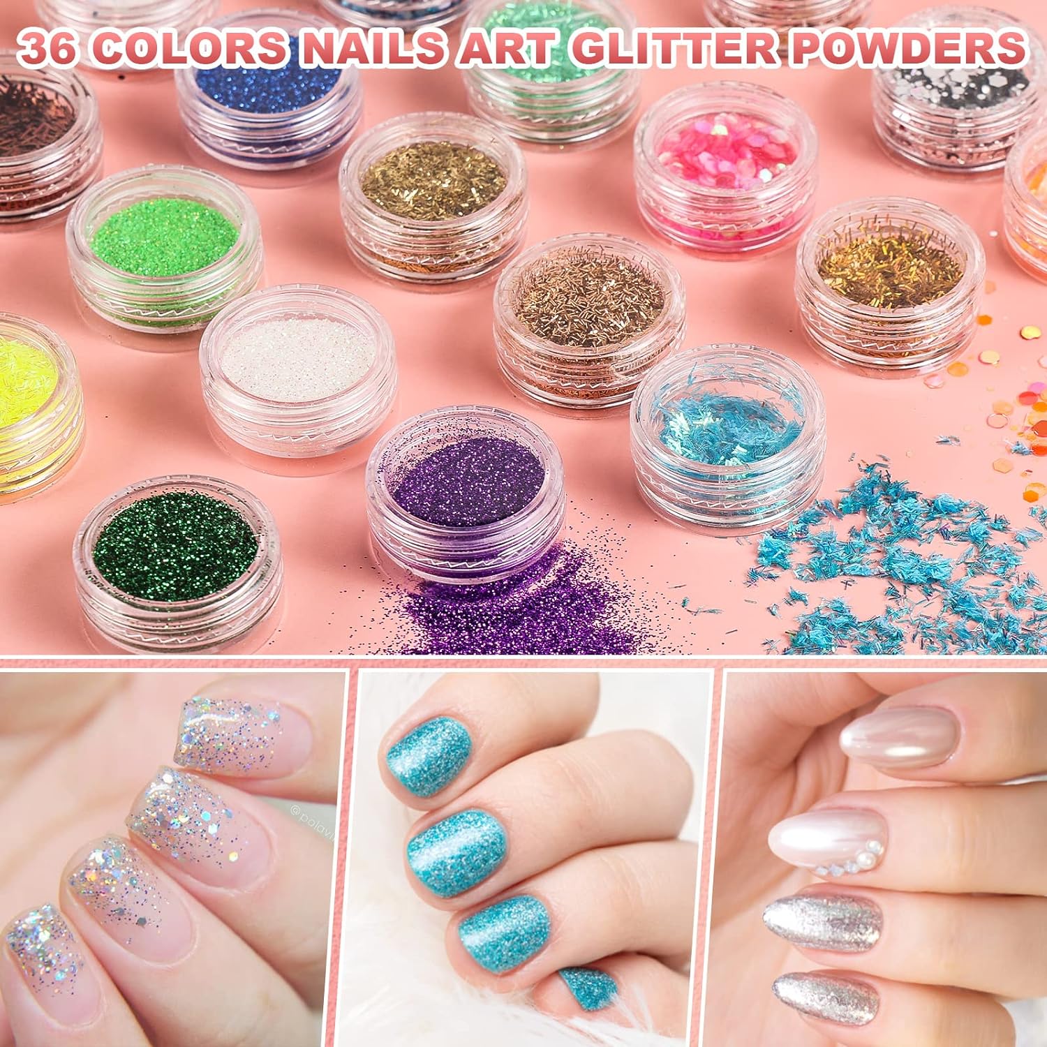 - 36 Glitter Acrylic Powder Kit: acrylic nail kit contain 3 pcs classic acrylic powders(clear,pink,white) 36 different colors glitter powder sequins set, shiny and colorful. Mix glitter and acrylic powder to get a new color and style. A variety of colors to meet a variety of creative needs Suitable for all seasons creating beautiful nail for long lasting sparkle nail tips.