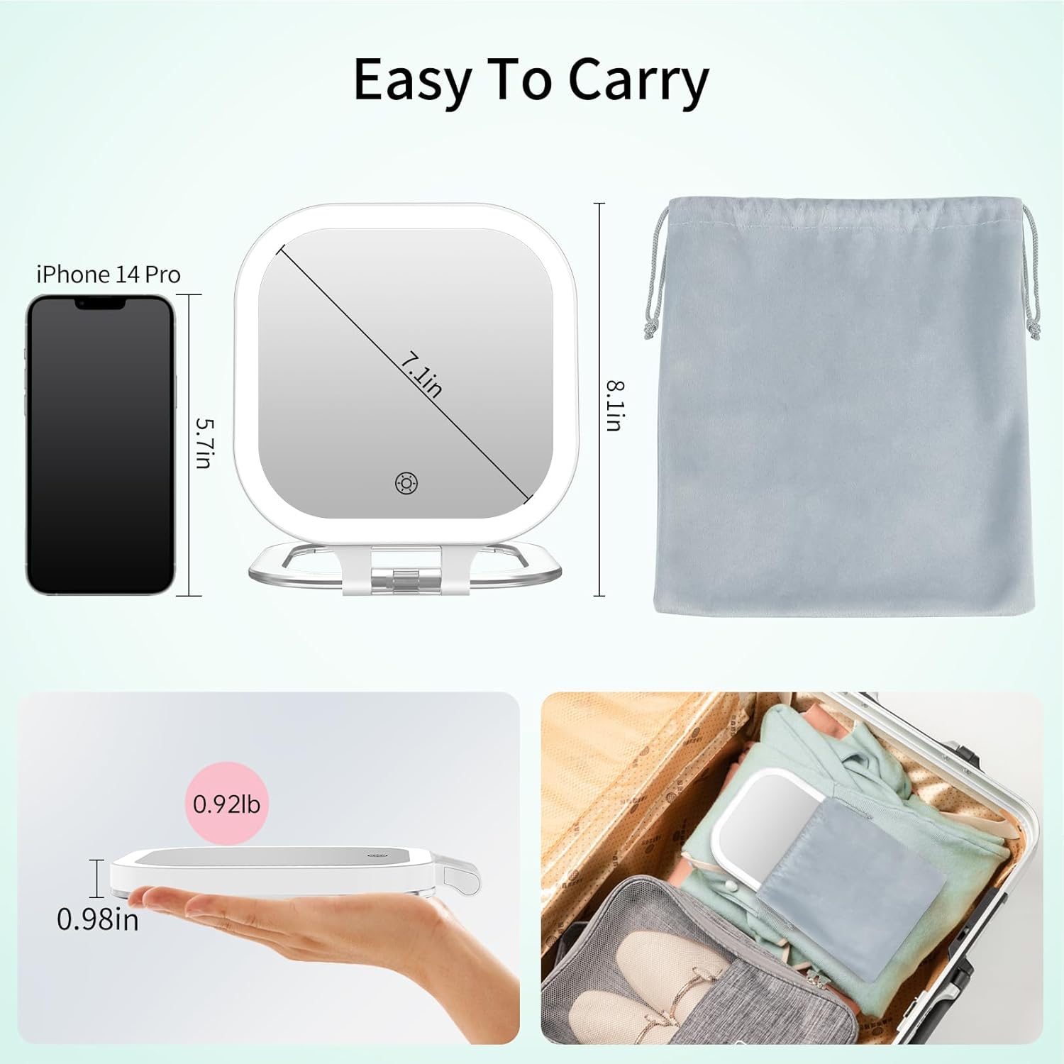 - 💝【FASCINATE 2025 Upgraded Travel Makeup Mirror】 In response to customer requests for a more travel-friendly magnifying makeup mirror, we have upgraded the 2000mAh rechargeable lithium battery. The travel mirror with light can be used for 6-10 days when fully charged. The travel mirror size is: 8.1 * 7.1 * 0.98 inch, weights only 0.9 lb, which is enough to meet your makeup and touch-up needs for daily commuting and 2-3 days of business or travel.