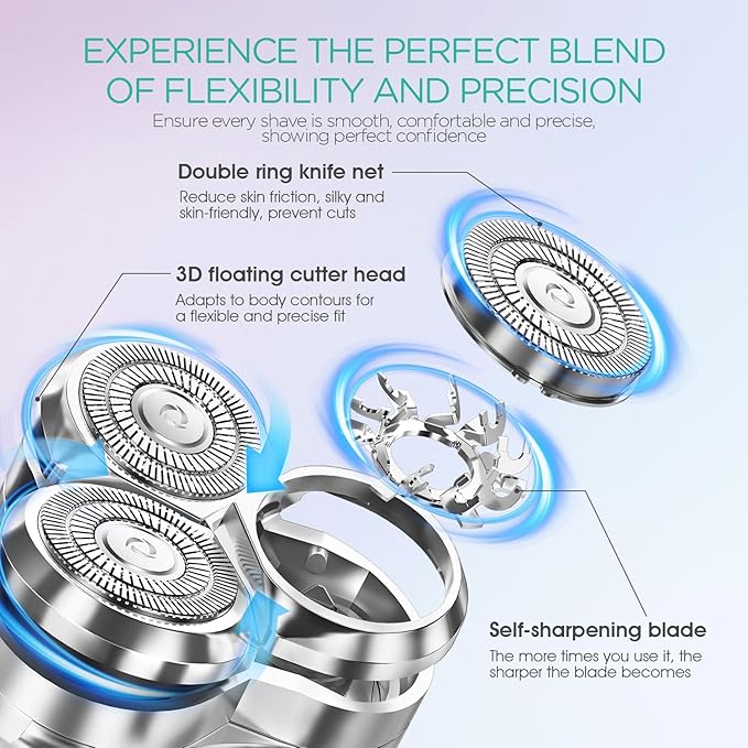 - Efficient And Long Lasting: 3D floating womens razors comfortably faces different contours and fits your body curves! Fast cutting with powerful motor, It shaves hair efficiently and closely. Internal self-sharpening blade design, blade and mesh grinding each other, the longer you use it, the sharper it gets, no need to worry about changing the blade frequently!