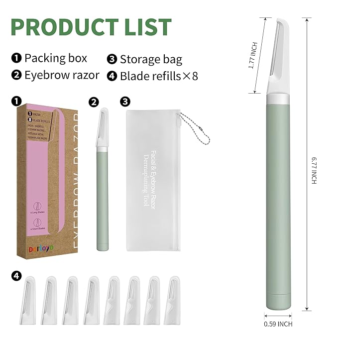 - 【Eyebrow Razors Kits】This eyebrow trimmer has a replaceable design for the blades, our unique design reduces waste and the dermaplaning blades are conveniently replaced once a month. Gently and painlessly remove unwanted eyebrows and facial hair with Derloyo's specially designed dermaplaning tool.