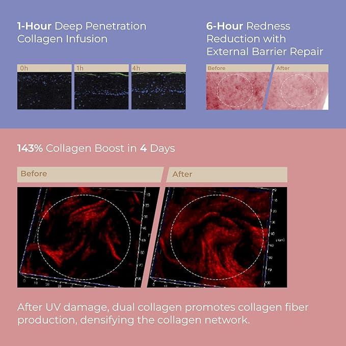 - 143% Collagen Increase in 4 Days: Achieve deep collagen replenishment in just 1 hour, with effective redness reduction within 6 hours. After 4 days of continuous use, collagen levels increase by 143%, repairing UV damage and helping rebuild collagen fibers.