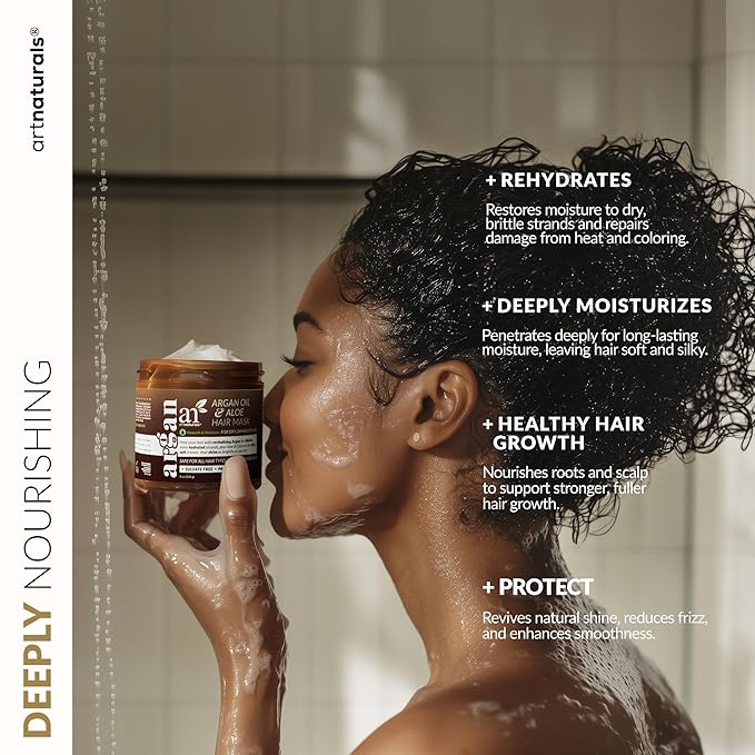 - 2. Intense Hydration & Damage Repair: Restore dry, brittle, or damaged hair with our deeply hydrating hair mask enriched with Argan Oil, Jojoba, Aloe, and Keratin. This salon-quality formula strengthens strands, reduces breakage, and revives your hair’s natural shine and softness. Perfect for all hair types, including curly, straight, or color-treated hair, for long-lasting moisture and vitality.