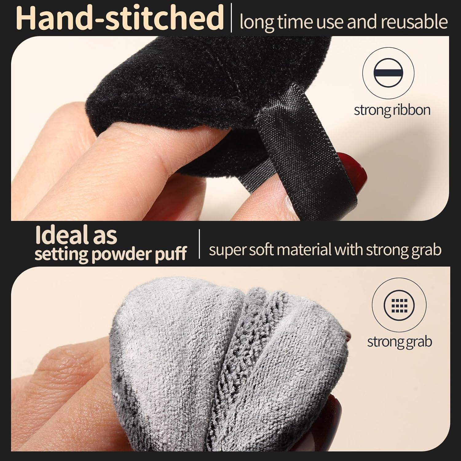- Strong Grab Makeup Puffs: The fabric has 1.2 mm of fluff, can well catch and hold the powder, minimize the makeup wastage and evenly apply powder on the skin. Our small powder puffs are hand-sewn and washable, and the sturdy ribbon design is easy for you to hold tightly, ensures a better control and makes a more precise apply. Essentials for your makeup routine