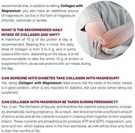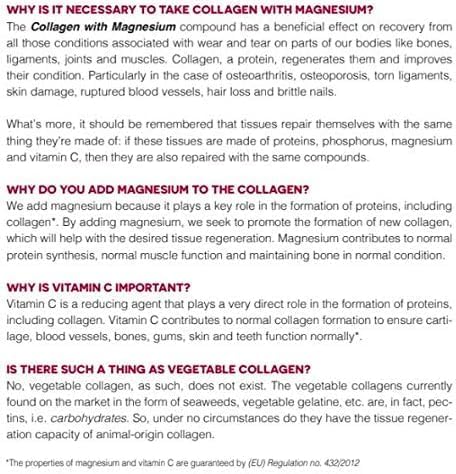 - BENEFITS-- Both Magnesium and Vitamin C are essential for collagen creation, making this product the perfect natural supplement you need. IMPROVES skin elasticity, hair growth and helps gain and mantain muscle mass. Reduces tiredness and fatigue.