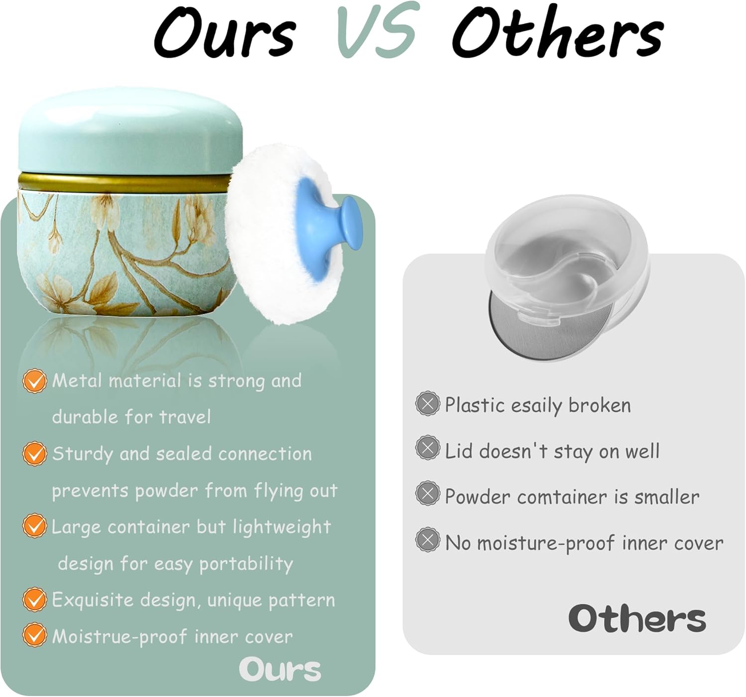 - The powder box has a delicate appearance and a variety of patterns for you to choose. The powder box is made of high-quality tinplate, which are not easy to break after being dropped, and not fade easily, and can be used for a long time. There is also a lid inside the powder box, so you don't have to worry about spilling powder.