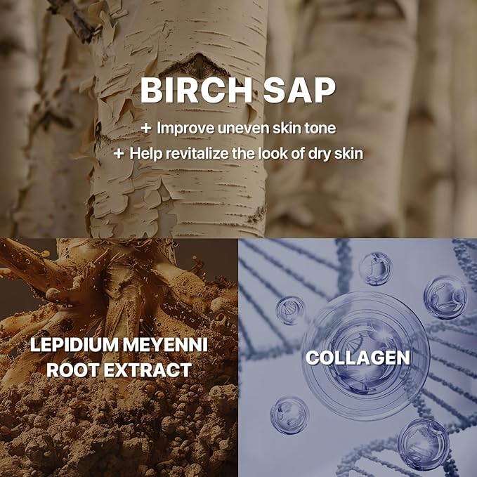 - [Key Ingredients] BIRCH SAP : Relieves dryness, Strengthen skin hydration level & moisture barrier. LEPIDIUM MEYENNI ROOT EXTRACT : Improve uneven skin tone & Helps revitalize the look of dry skin COLLAGEN: Enhance softer feel. Repairs & strengthens moisture barrier