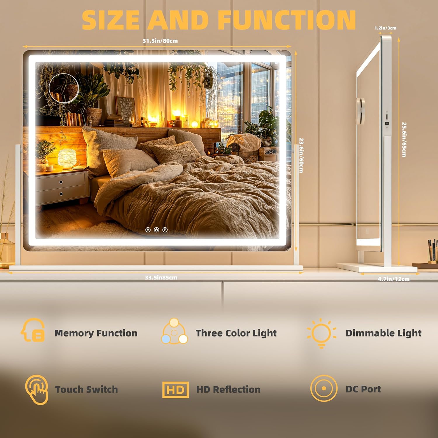 Vanity Mirror with Lights, 34'' x 25.6'' Lighted Makeup Mirror, Touch Screen with 3-Color Lighting, Dimmable for Vanity Desk Tabletop Round White