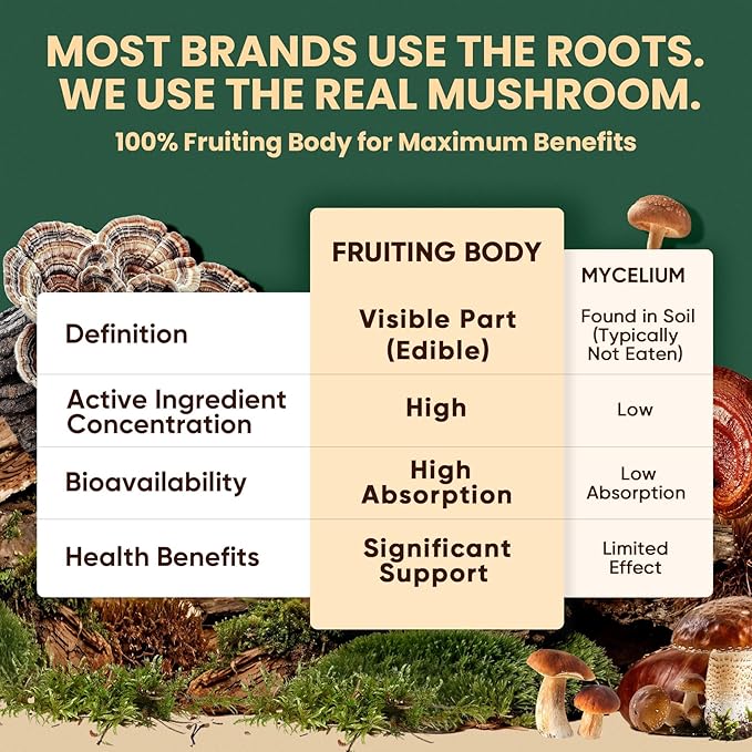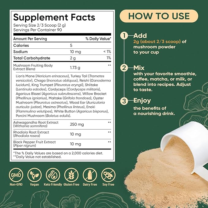 - 16-Mushroom Power + Adaptogens: Fuel your body and mind with 17,300mg of 16 functional mushrooms including Lion’s Mane, Reishi, and Chaga, plus Ashwagandha and Rhodiola for stress and focus. Made with 100% fruiting bodies and no fillers to support clarity, immunity, and clean energy