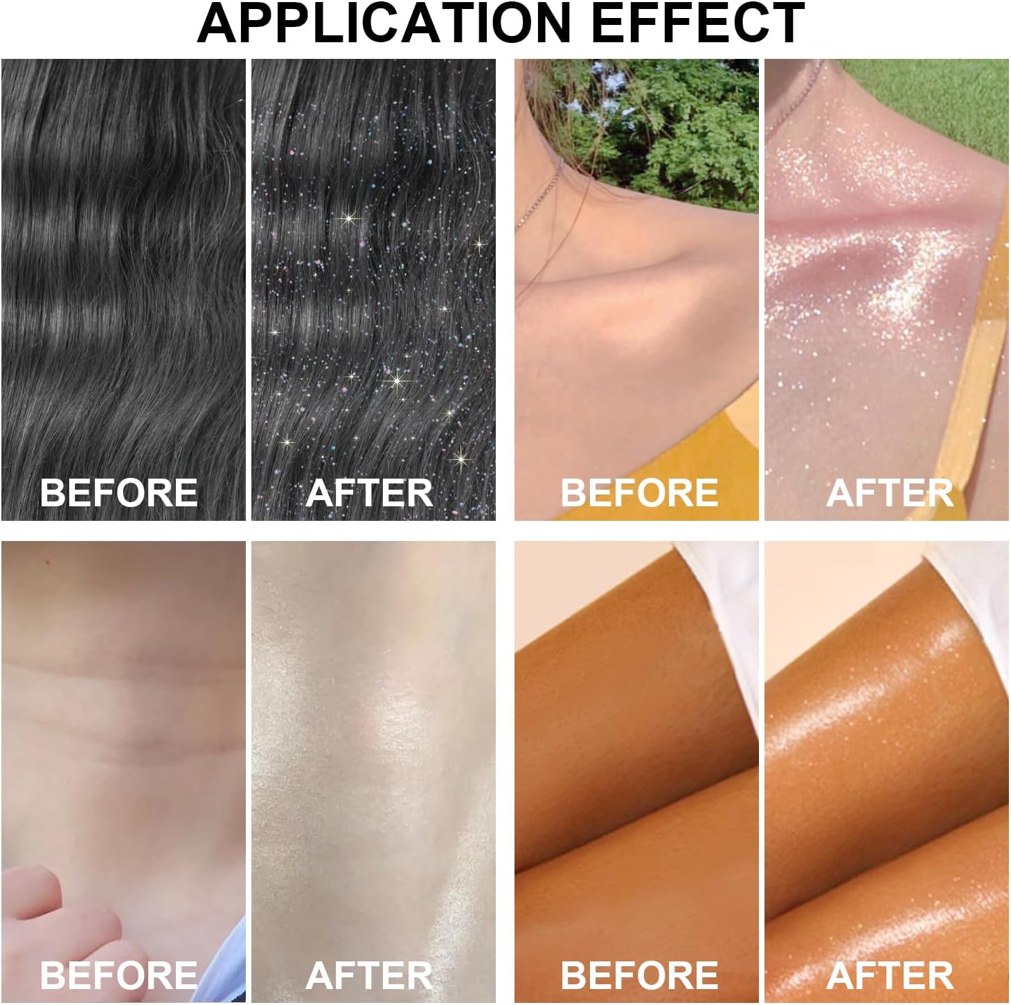 - Glitter Body Spray - The delicate and light glitter shimmer Powder easily to spray on hair, eyes, face, body, leg and clothing with shimmer makeup effect. Perfect to enhance skin gloss, unlock and set your shimmer makeup.