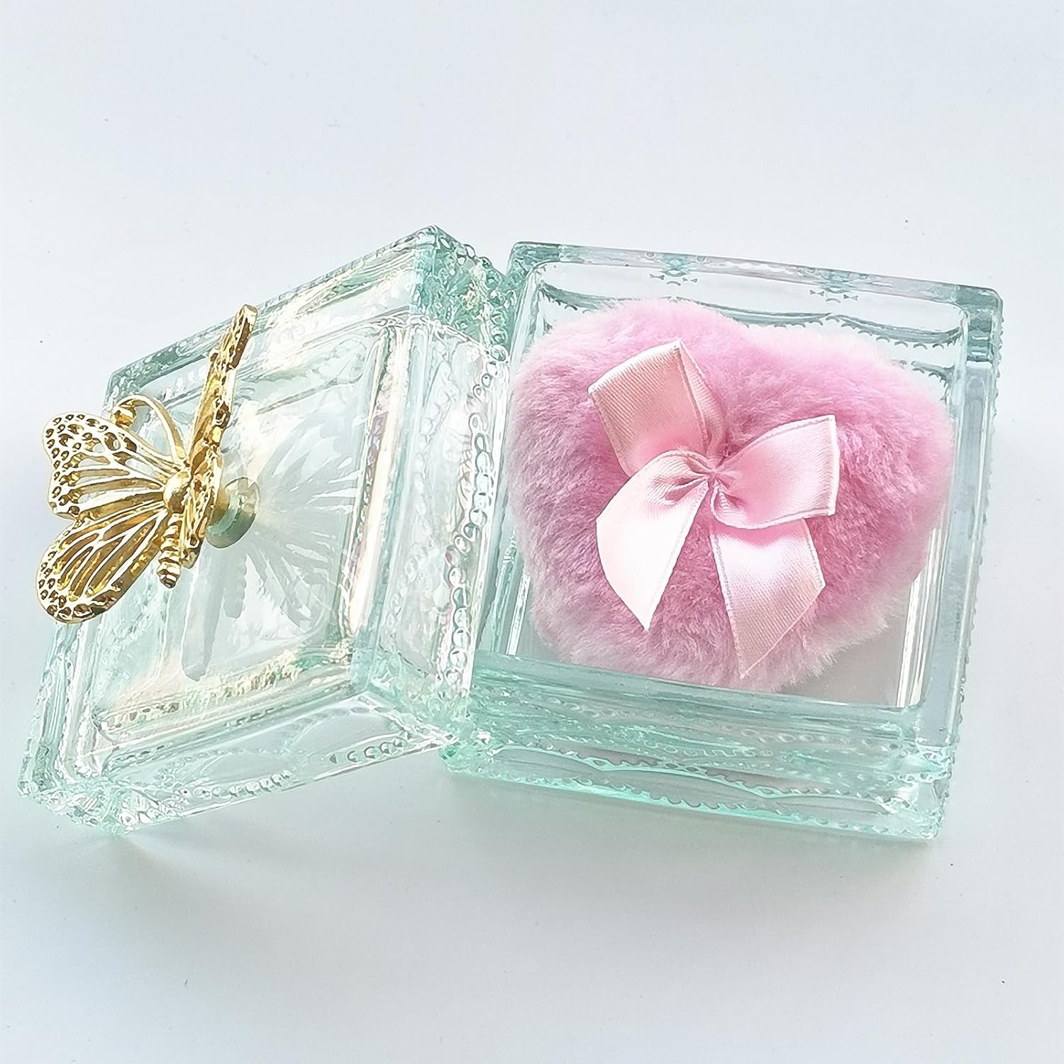 - 【Unique Design】This classic glass powder puff case has delicate and lovely beautiful embossed pattern and gold butterfly decorations, which makes you shine, the powder puff case measures 3.23 inches L x 3.23 inches W x 2.95 inches H, designed for dresser storage and decoration.