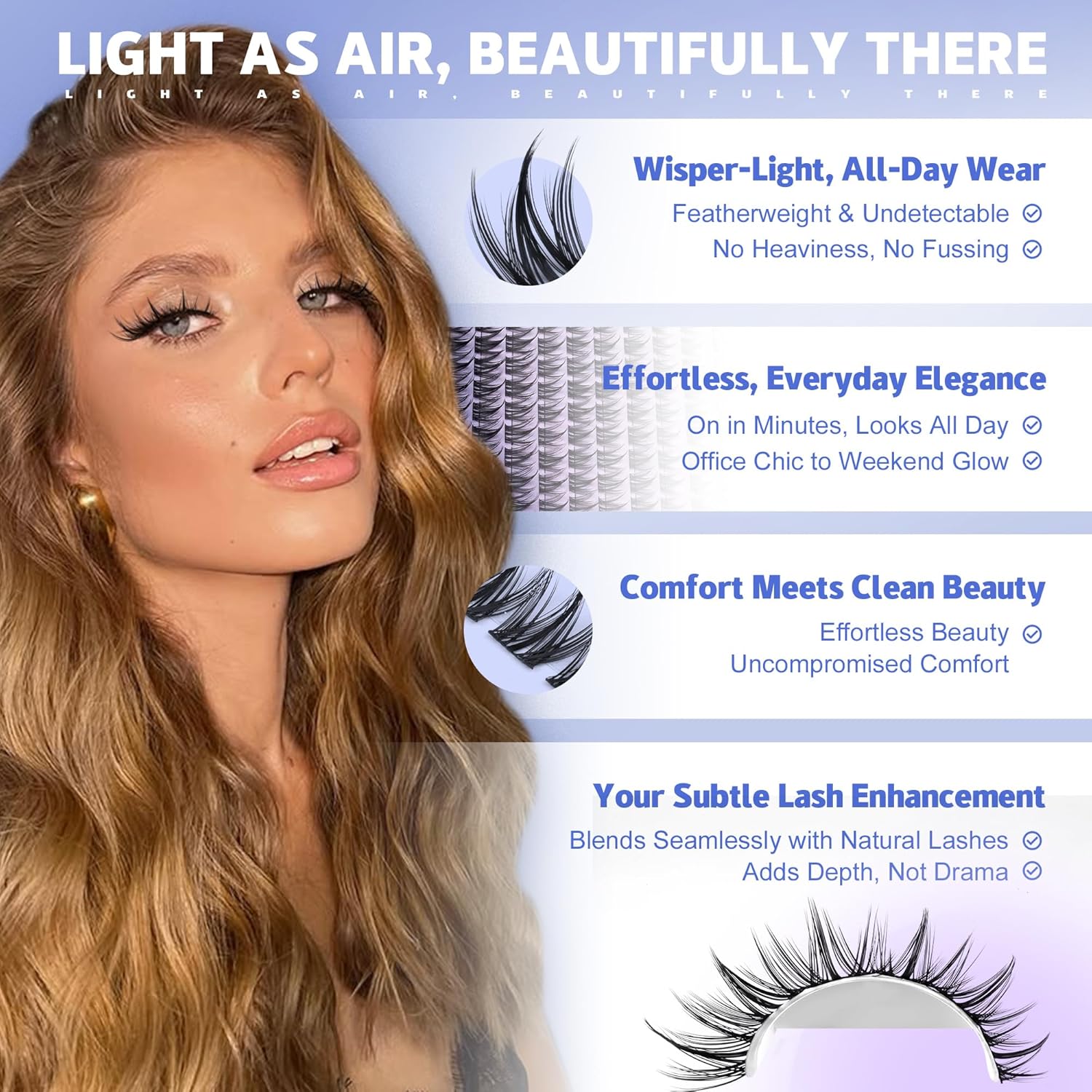 - Cloud-Soft, Weightless Band: No poky knots, no heavy feeling. Our featherlight, flexible band hugs your lash line comfortably for all-day wear, letting you blink and go without a second thought
