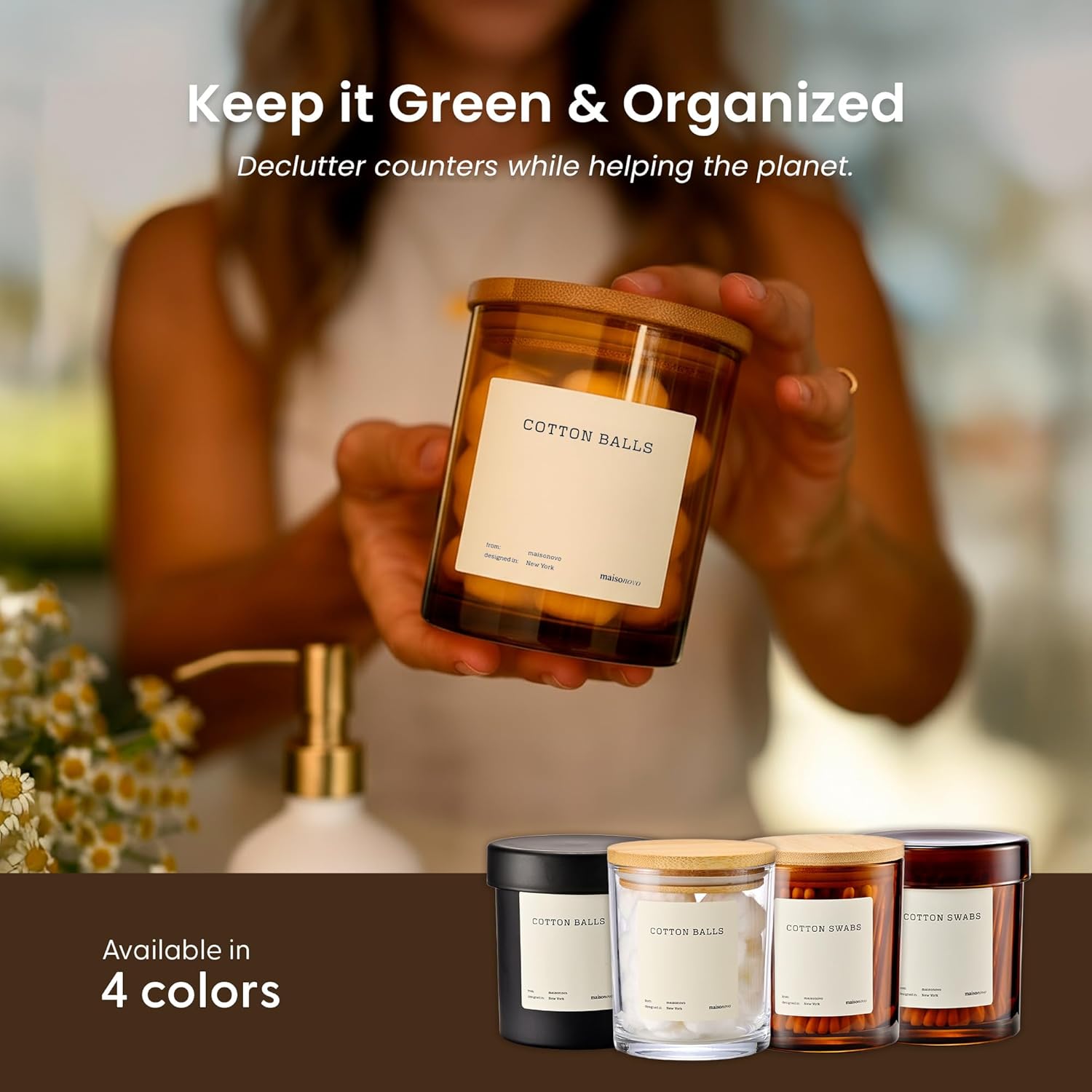 MaisoNovo Qtip Holder Bathroom Set – Airtight Cotton Ball Holder with Lid to Store Cotton Rounds, Swabs, Floss Picks, Hair Ties with free labels pack - 2 Amber Jars with Bamboo Lids