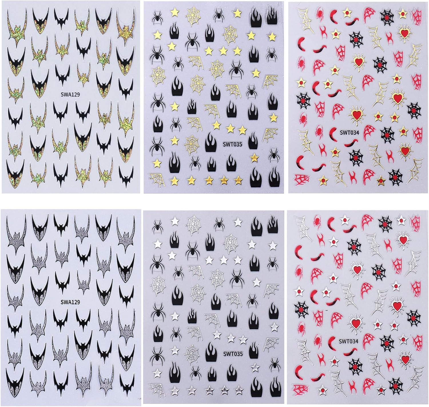 6 Sheets Halloween Nail Stickers Gold Silver Nail Art Stickers Bat Spider Web Stars Nail Decals with Glitter Bat Spide Love Design Nail Art Sticker Decoration for Women Girls Manicure Supplies