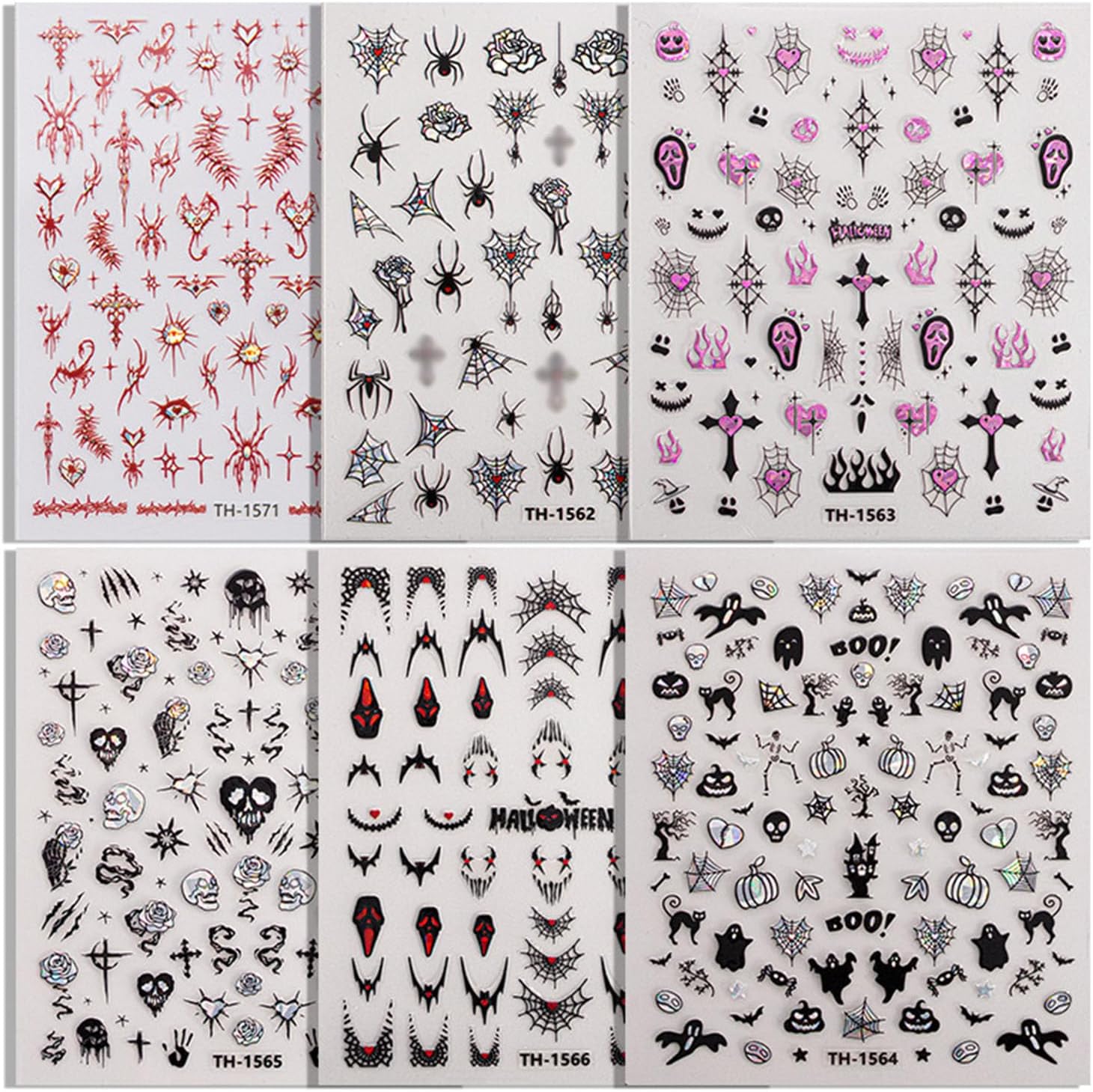 Halloween Nail Stickers Cute Ghost Nail Art Stickers Spider Web Pumpkin Spider Skeleton Bat Flower Design Halloween Nail Decals for Nail Art Holiday Acrylic DIY Nail Decoration 6Pcs