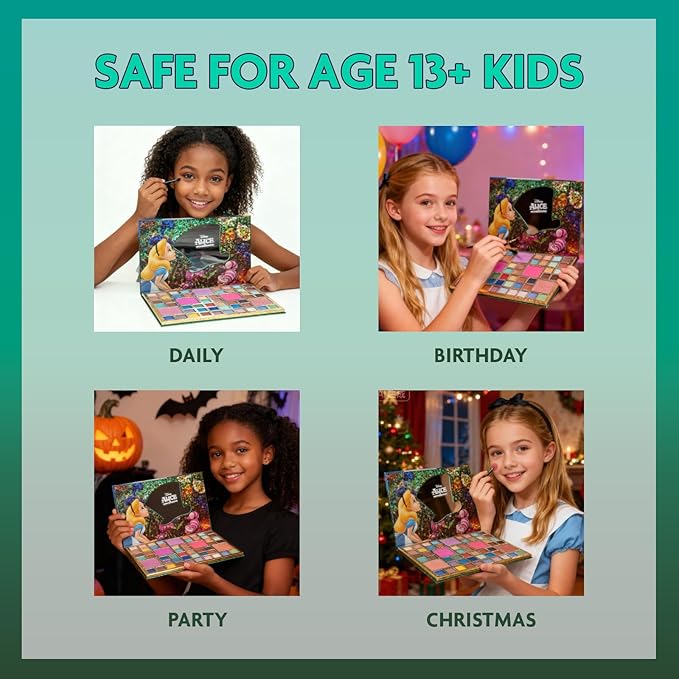 - Mess-Free, Worry Free Fun: Every eyeshadow, blush, and highlighter features a smooth, blendable formula that’s easy for kids to apply and just as easy to wash off with water, so there is no harsh scrubbing needed, no fuss, and no stress. Whether she’s channeling Alice's curiosity or creating her own signature look, this palette makes beauty time simple and creative while making cleanup a breeze for both kids and parents.