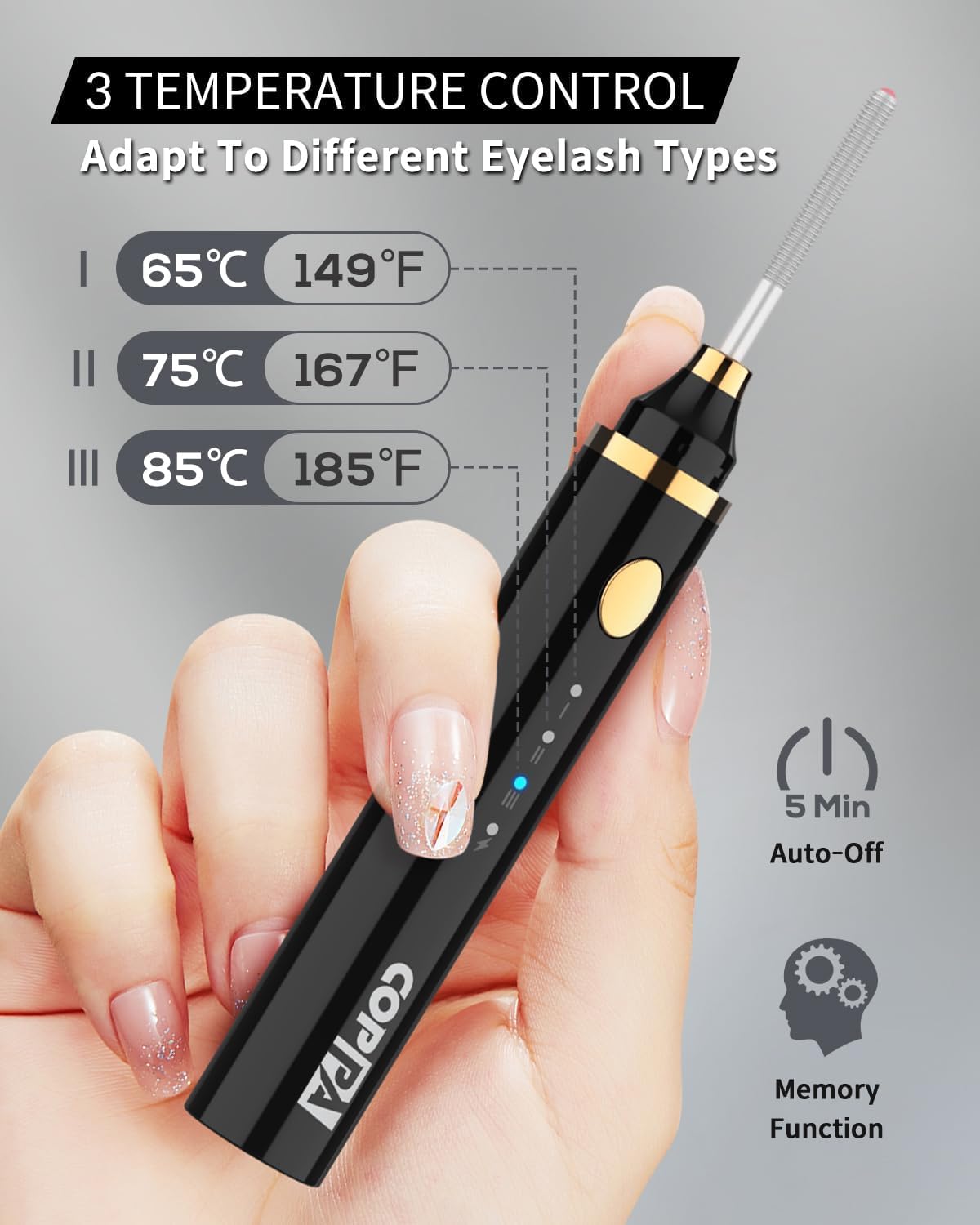 - 【𝐀𝐝𝐣𝐮𝐬𝐭𝐚𝐛𝐥𝐞 𝐓𝐞𝐦𝐩𝐞𝐫𝐚𝐭𝐮𝐫𝐞 𝐒𝐞𝐭𝐭𝐢𝐧𝐠𝐬】𝐅𝐞𝐚𝐭𝐮𝐫𝐞𝐬 𝟑 𝐡𝐞𝐚𝐭 𝐬𝐞𝐭𝐭𝐢𝐧𝐠𝐬 (𝟔𝟓°𝐂/𝟕𝟓°𝐂/𝟖𝟓°𝐂). Level 1 65 ℃ for soft short eyelashes, level 2 75 ℃ for normal thickness of eyelashes, level 3 85 ℃ for long hard eyelashes. The 𝐦𝐞𝐦𝐨𝐫𝐲 𝐟𝐮𝐧𝐜𝐭𝐢𝐨𝐧 saves your preferred temperature, while the 𝐚𝐮𝐭𝐨-𝐬𝐡𝐮𝐭𝐨𝐟𝐟 ensures worry-free operation.